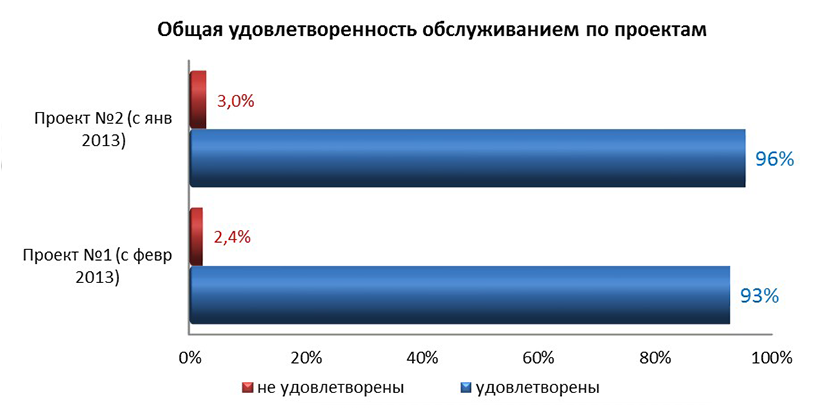 Показатель повторных покупок составляет 96%, наши клиенты ежегодно продлевают контракты по «Горячим Линиям» с нашей компанией. Основная причина – качество обслуживания, так как опросы потребителей, обращающихся в наш Call Center, показывают высокую степень удовлетворенности – 93-96%.